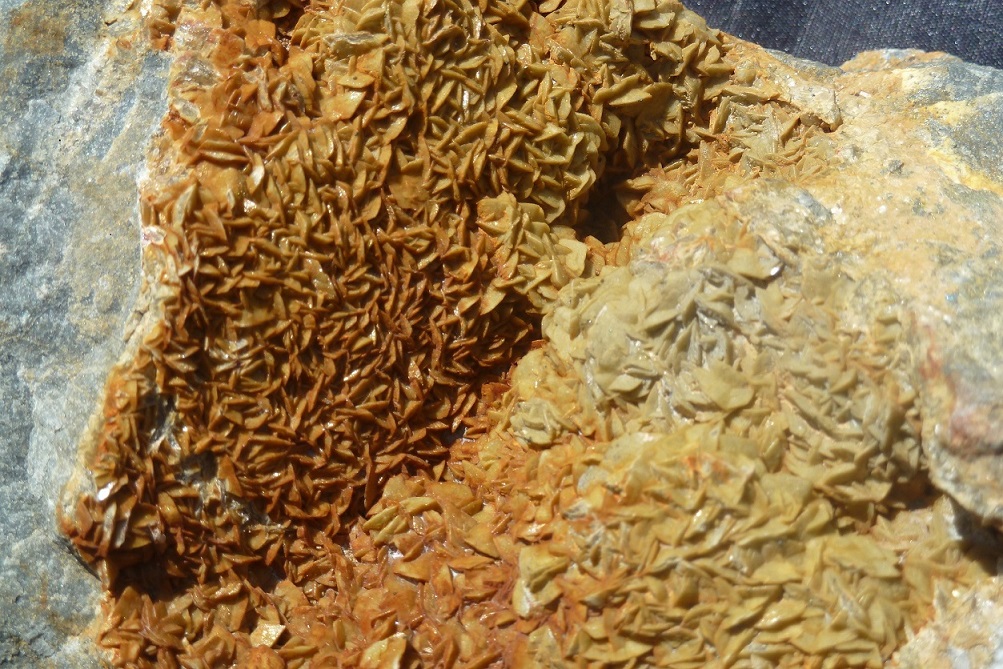 Et puis le mica c'est un minéral qui constitue la roche, avec le quartz et les feldspaths dans le cas d'un granite par exemple (je connais pas le contexte géol à Petit-Mars), or là on voit bien qu'il s'agit d'une minéralisation secondaire, ça a cristallisé sur une éponte avec des petits quartz..