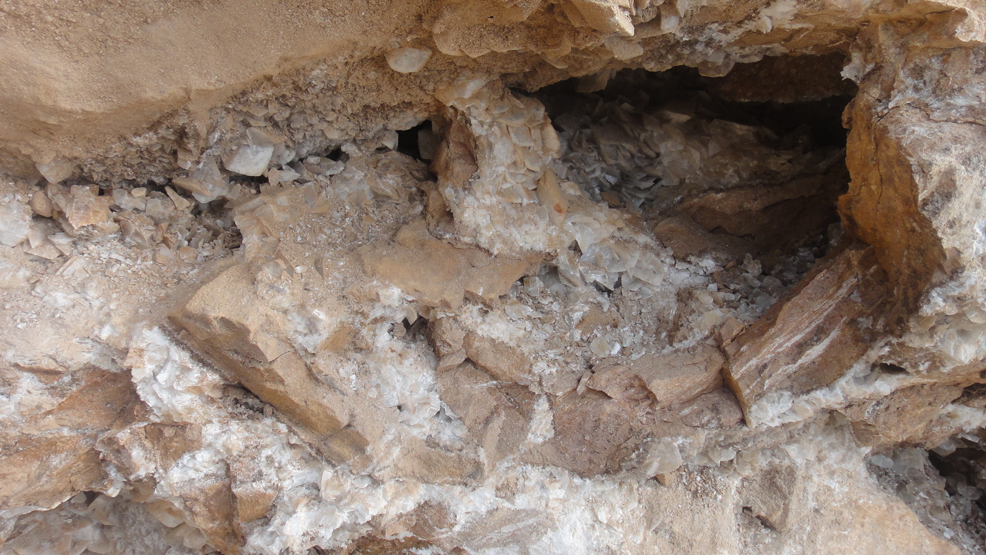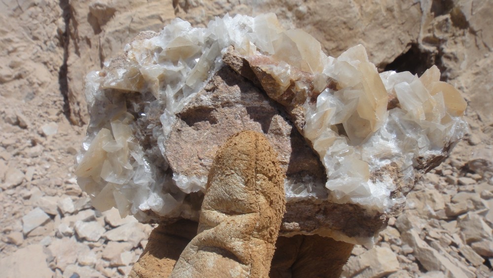 Photos 3 et 4, je dirai calcite aussi. Il s'agit (apparemment) de fragments de cristaux. Il me semble que  la face au dessus de ton pousse sur la photo 3 et la grande face sur la photo 4 sont des clivages. Les clivages à l'intérieur du cristal sur la photo 4, l'éclat des cristaux, les photos de terrain : tout évoque  la calcite.