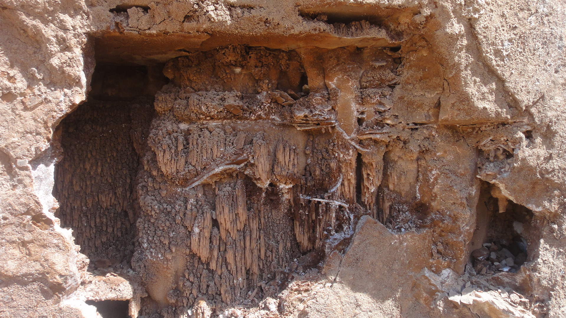 Des cristallisations en forme de stalactites dues à des infiltrations d'eau souterraine.