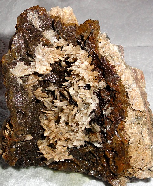 Bonjour a tous,petite virée d'hier dans l'herault,une ancienne galerie paumée au milieu de chênes verts ,il y a bien longtemps que la nature est tranquille à cet endroit,voici une des découvertes ,d'autres vont suivre aprés photos. La piéce mesure 12 cm/8cm Aragonite/ankerite.