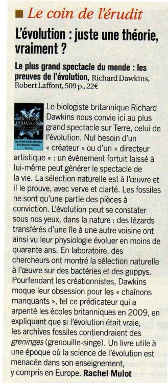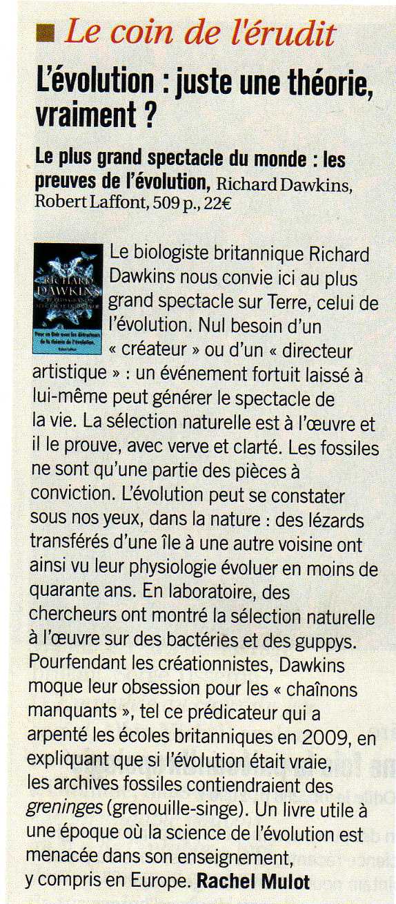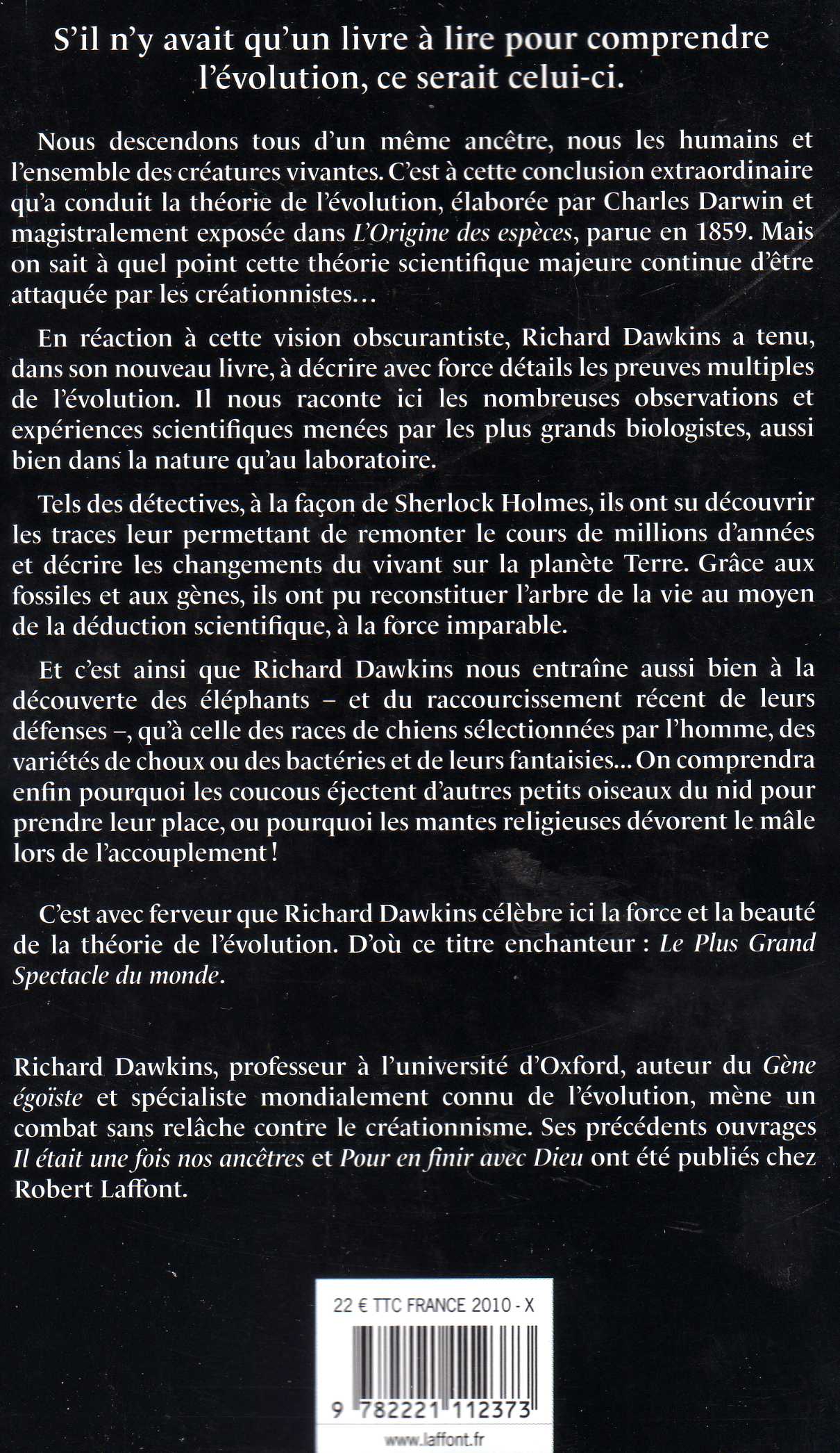 voici un nouveau livre sur l'évolution que je ne peux que conseiller à tous ceux qui douteraient du fait évolutif, ou bien chercheraient des éléments de réponses pour clouer le bec aux créationnistes. Il est écrit par le professeur universitaire Richard Dawkins de Oxford University; j'epère que cette référence et le prestige de cette Université suffiront pour convaincre que je suis depuis longtemps dans le vrai.
