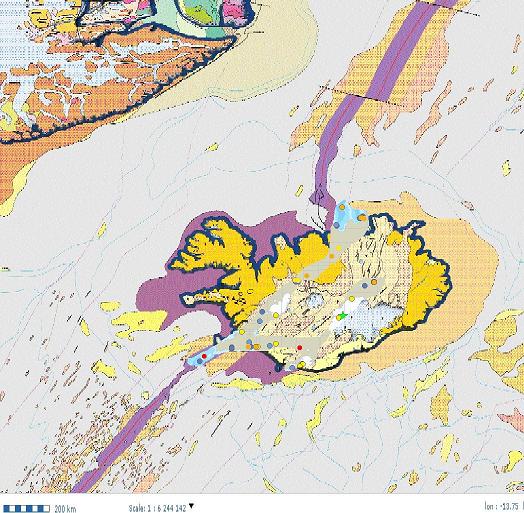 En particulier le lineament 24W,63N30' et 19W30',65N15' qui passe a qq km au N de Reykjavik et qui se prolonge jusqu'au point de seisme de la carte poste le 30/10 (étoile verte)