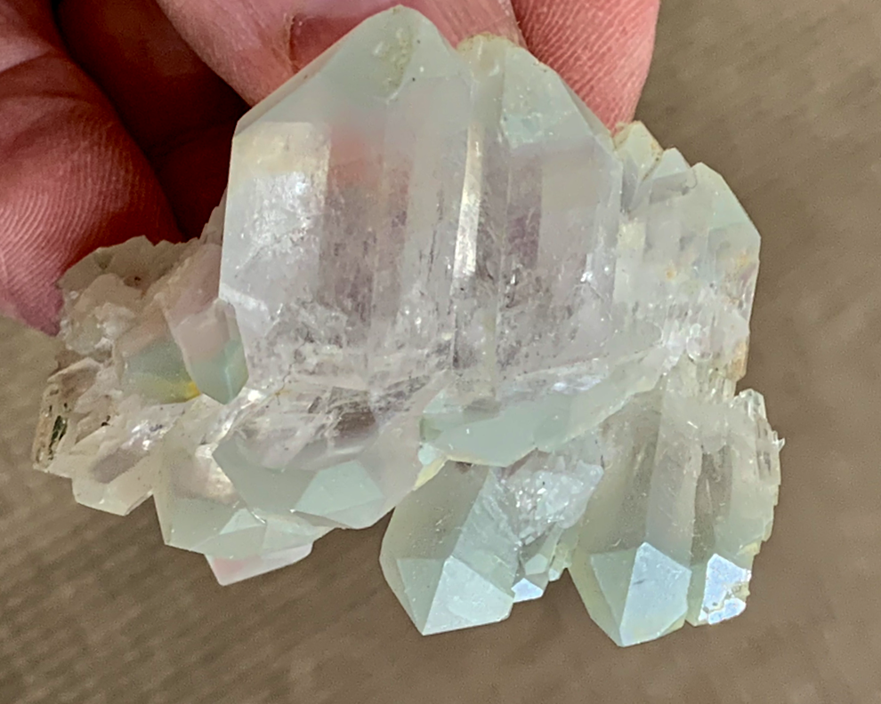 3 faces lisses, 3 faces chloriteuses, comme souvent dans cette poche. Ici on dirait que les faces chloriteuses n'ont pas eu une autre génération de quartz par dessus, alors que les faces lisses si. Enfin je sais pas trop c'est un peu bizarre