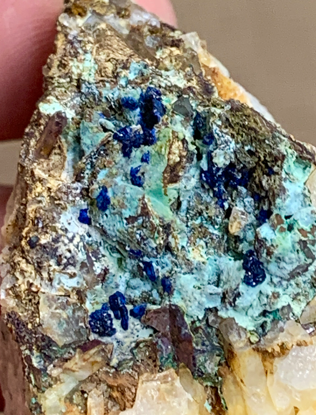 Azurite en pustules millimétriques avec Malachite et un carbonate bleuté (Aragonite ?) dans les crevasses de la Chalcopyrite / Cuivre gris oxydés [chp 30mm]