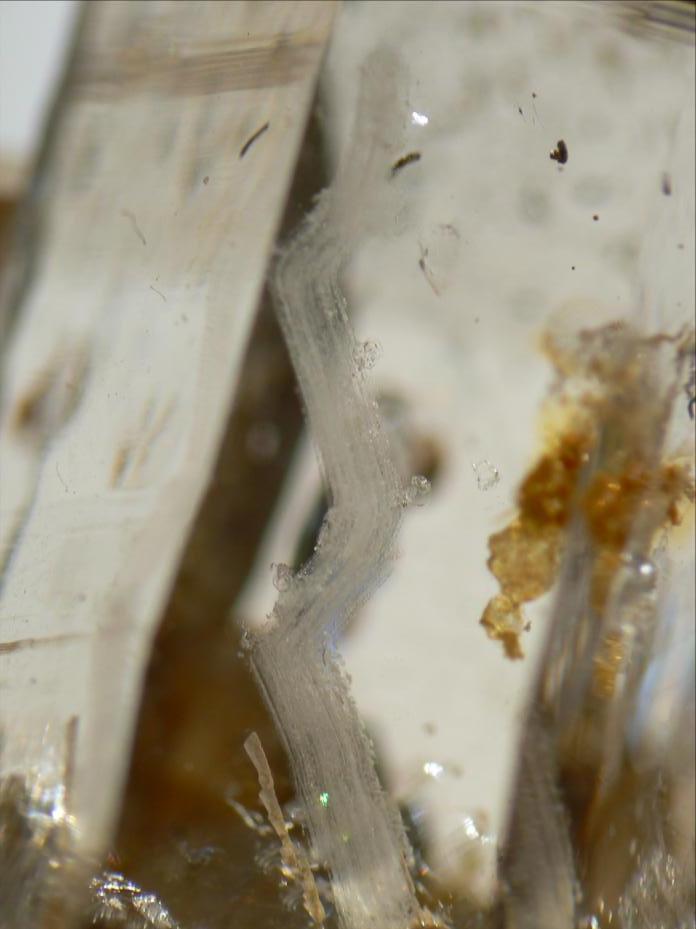 • Dans les sceptres améthyste du Mt-Blanc, la partie améthysée correspond à l'ultime génération de quartz, les précédentes sont macromosaïques, la génération améthyste est lamellaire…