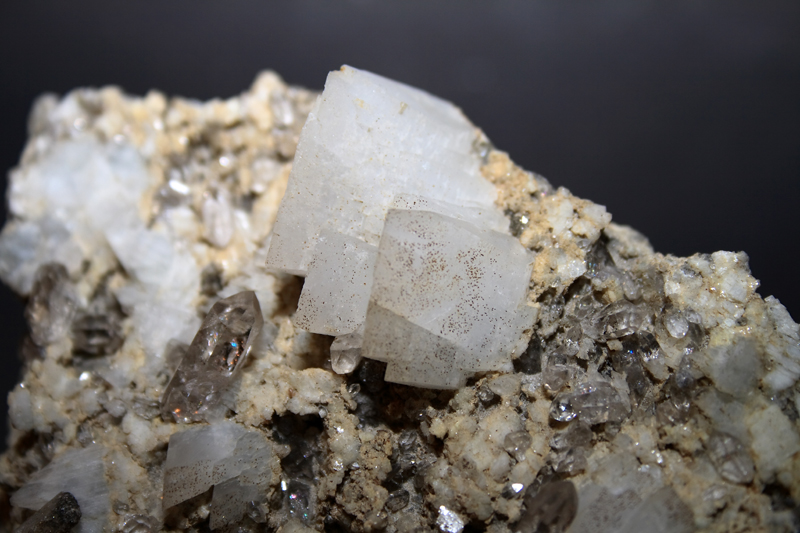 • La présence de fluorite cubique, qui fait la différence avec les classiques octaèdres roses, prouve des conditions T° (au moment de la cristallisation de la fluo, qui est aussi - dans le Massif - celui de la 3ième génération de quartz) moindres. (pour mémoire, la forme octaédrique correspond à une température + élevée) .