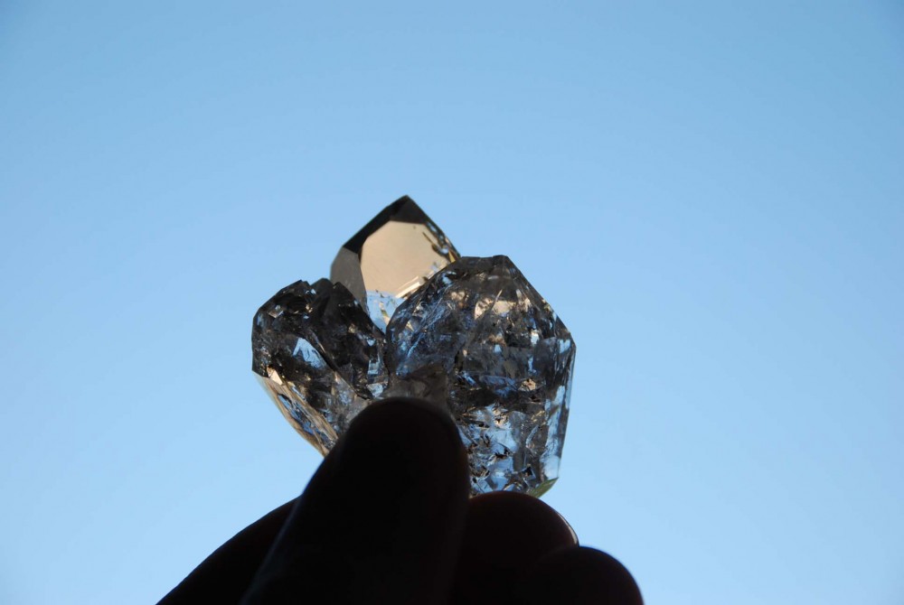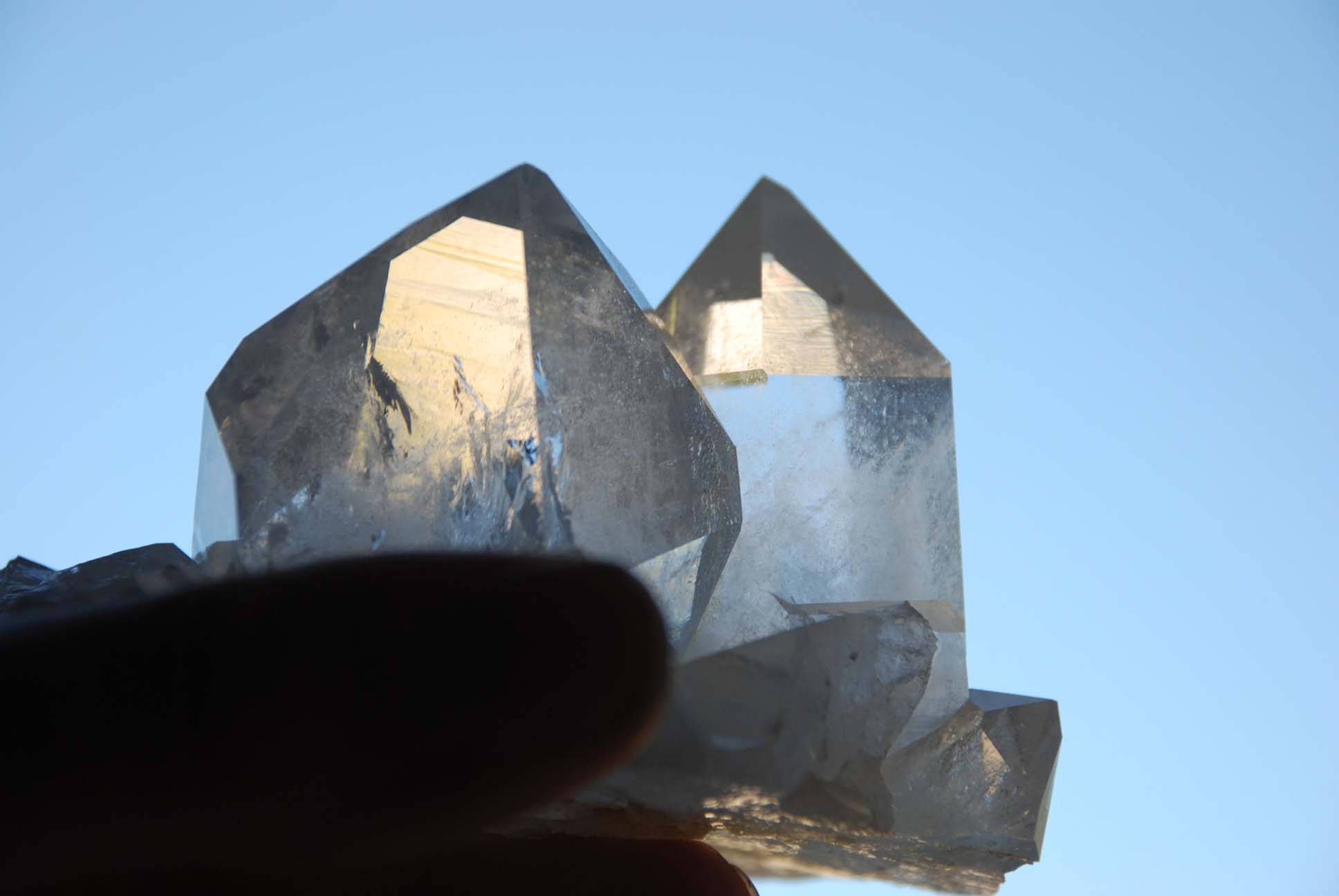 Quartz chloriteux et hyalin avec fantome chloriteux (pour les deux grosses pointes du fond) corrodés à la base pour certains