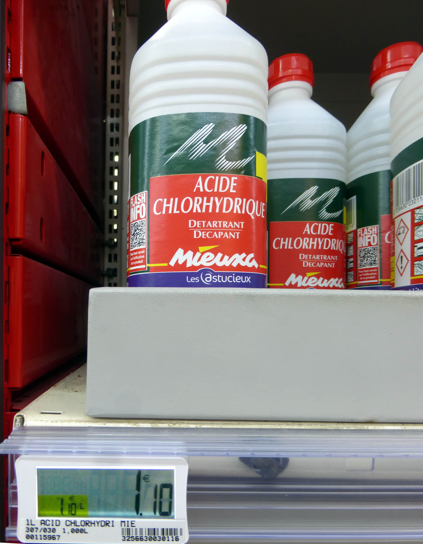 Dans les drogueries, grands magasins de bricolage, hyper marchés etc..., l'acide chlorhydrique a en général une concentration de l'ordre d'une vingtaine de pourcent, soit une concentration d'environ 6 à 7 moles par litre ou encore 260 grammes d'HCl par litre. La qualité du produit est assez variable suivant les fournisseurs. Parfois il est, comme il devrait être, parfaitement limpide et incolore mais souvent il est jaunâtre (présence de fer) et peut présenter une odeur d'œuf pourri (présence de sulfures).