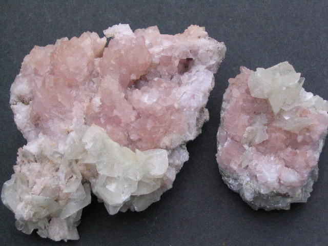 Du rose dont le porteur de couleur n'est pas bien déterminé: manganèse, ou fer ? Boules de "quartz rosé" dans des géodes de calcite, de l'Aalénien marno-calcaire de Lozère, à comparer avec les quartz rosés du Trias aveyronnais montrés sur ce même fil. Certains rares spécimens montrent une nuance de rose très pâle qui tire sur le mauve.