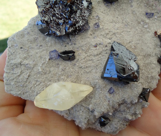 Photo 3 : fluorine bicolore (violet et surtout verte) d'Erongo (Namibie), avec aragonite, tourmaline noire et quartz.