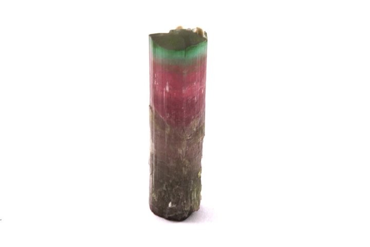 Wonderful tourmaline crystal from the Himalaya Mine, Mesa Grande, San Diego co., California, USA. This doubly-terminated elbaite crystal has incredible color zoning. The upper termination sports a bright green cap which grades into a wonderful pink into a steel grey and culminating in a cranberry cap on the lower pinacoidal termination. There is a natural bend in the middle of the crystal that adds to the aesthetics of the piece. Dug in the 1980s. 67mm x 21mm x 21mm. 49.8 grams