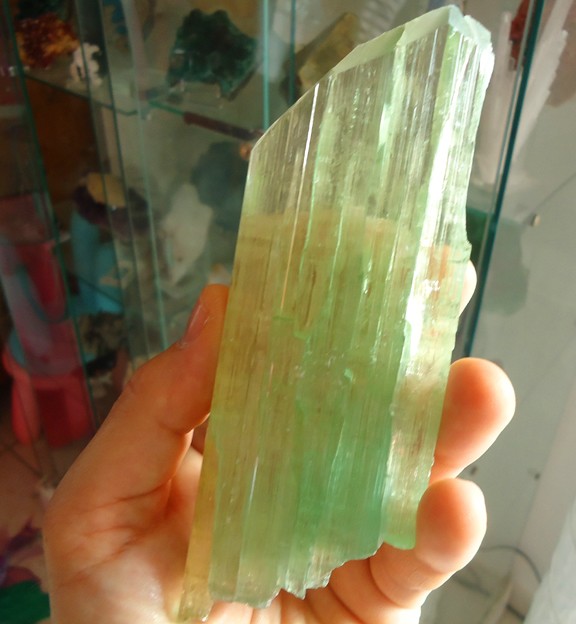 le truc c'est que la tourmaline rose et verte supporte mal l'irradiation (ou plutôt chauffage..): les exemplaires que j'ai pu voir prenaient une couleur orange... et celles ci presentes sur la piece semblent tout a fait normales..de plus la couleur n'est pas aussi foncée que sur les pièces a priori trafiquées..(plus vert pomme granny que emeraude!); ayant vu des exemplaires non traités auparavant, elle en semble tres tres proche..
