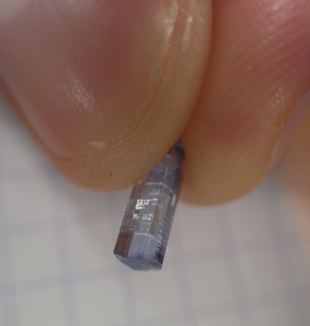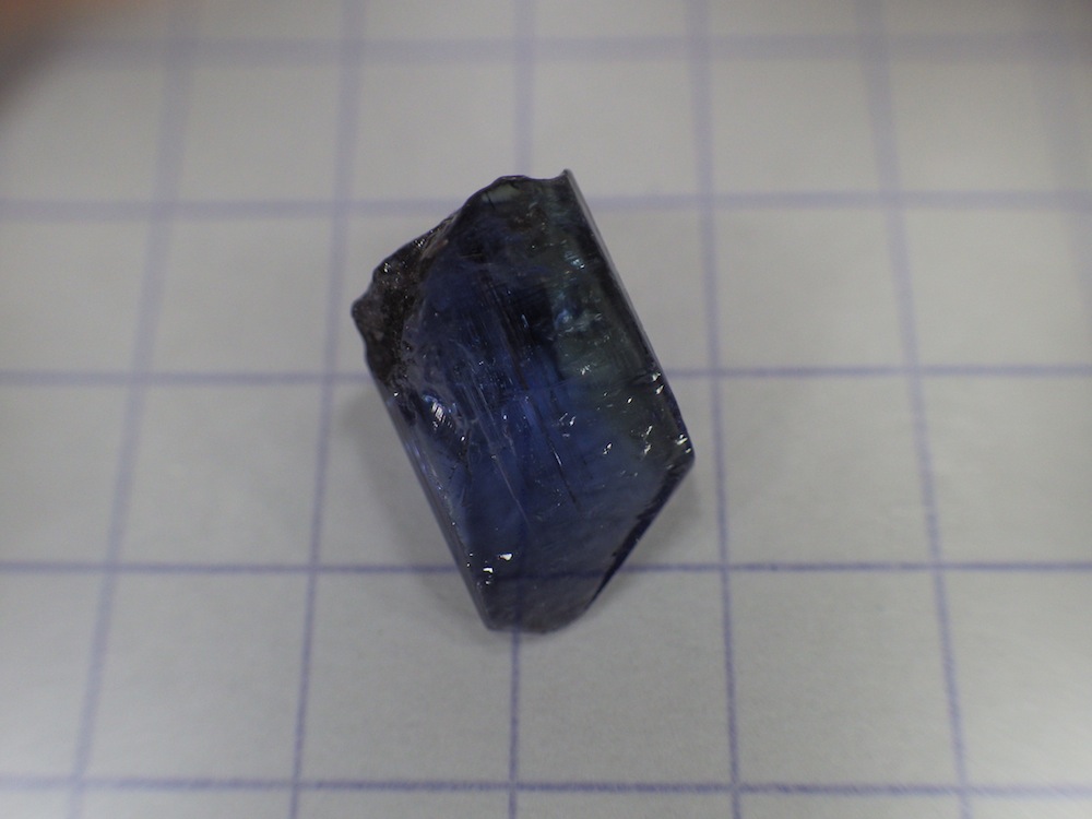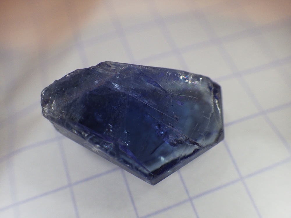 Deux petites Tanzanite en forme d'aileron. Je soupçonne la première de ne pas avoir été trafiqué par traitement thermique car son bleu est légèrement verdâtre (en haut) et la couleur jaune est visible sur l'axe c.
