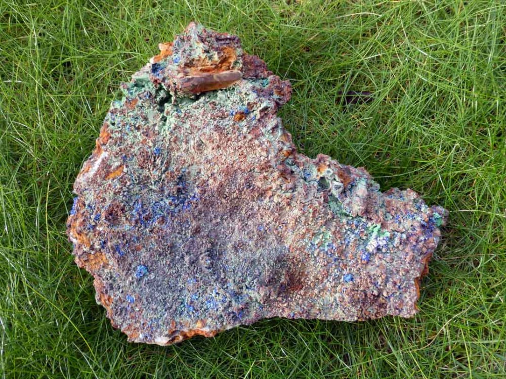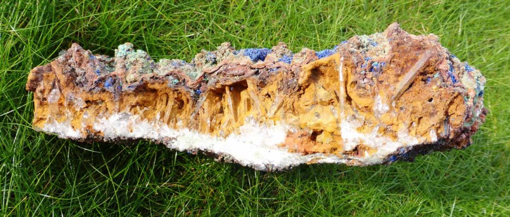 Il s'agit coté minéral, d'une Triplite avec quelques filonnets d' Hureaulite massive et de la Vivianite. En fait il s'agit certainement de Phosphosidérite et non de Vivianite.
