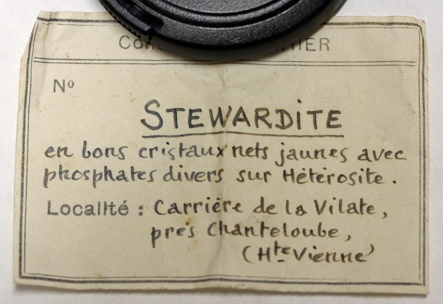 Si l'échantillon vient de la collection Didier puis Behier, je parie que l'étiquette est d'Alluaud et que c'est l'un des 5 ou 6 échantillons originaux. La collection Alluaud a été donnée au musée de l'évêché à Limoges vers la fin du 19ème (je n'ai pas la date précise). Didier n'a jamais connu Alluaud, mais il a été conservateur de cette collection. L'échantillon a pu être récupéré à ce moment là (par échange ?). Sinon, la même collection a été réorganisée par Recoing, Fitte, Laucagne, sous la direction de Saintfield en 1963. Des échantillons ont aussi pu s'évaporer à ce moment là (surement par échange !), il faudrait voir avec les derniers acteurs encore en vie). Les deux échantillons dont j'ai mis en photo les étiquettes proviennent de la collection Recoing. Concernant les autres échantillons, ceux de la Vilatte, Didier y a beaucoup gratté. La méthode d'acquisition fait moins de doute.