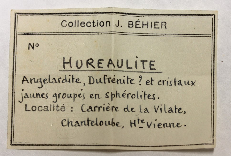 Conernant la première hureaulite, celle des Hureaux, on ne voit pas bien sur la photo, mais elle ressemble aux échantillons du même gisement conservés au MNHM. C'est des encroutements violets avec des pointements cristalins. Il faudrait un plus gros plan. Celle de la vilatte, orange, ressemble comme deux gouttes d'eau à l'échantillon type conservé. Ce dernier vient de la Vilatte et non des Hureaux. Concernant l'étiquette de la première, en voici deux que je pense du même auteur. J'ai aussi des lettres de lui. Il détache les lettres. Les n ne correpondent pas, mais dans les lettres on voit les deux types. De plus le 25 me fait penser à l'année de découverte. Pourrait-on connaitre la collection d'origine de cette pièce ?