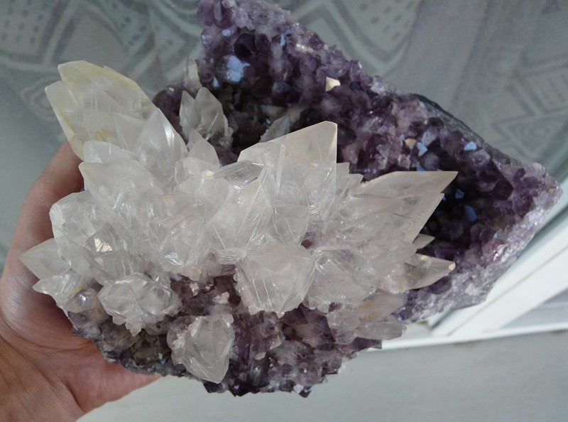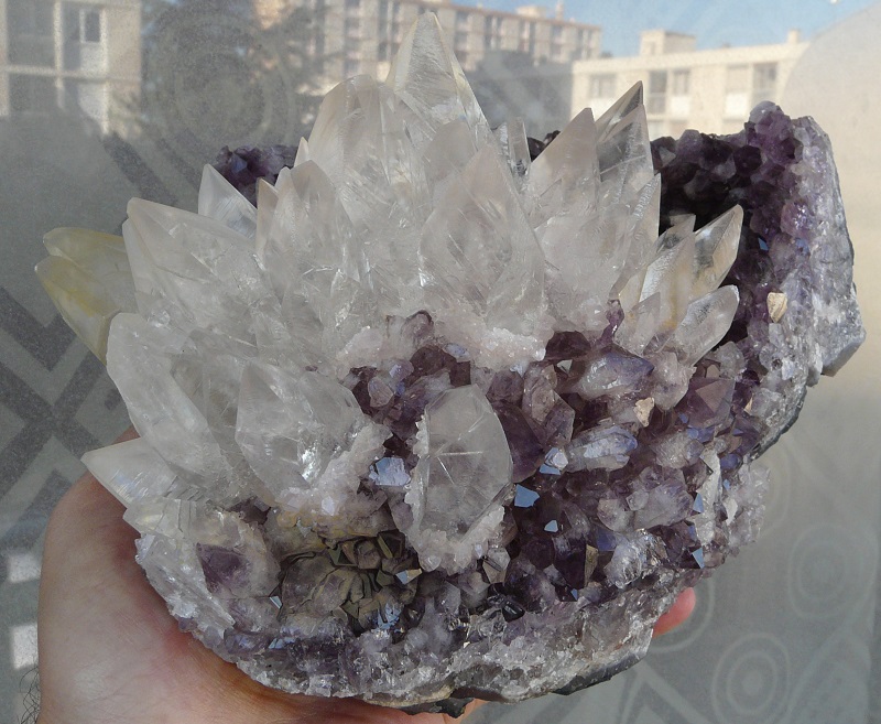 J'avoue que la calcite sur améthyste, elle envoie. Les cristaux sont superbes, on pourrait avoir un zoom sur quelques cristaux de calcite s'il te plait ? Il semble qu'il y ait des petites choses à observer dessus.