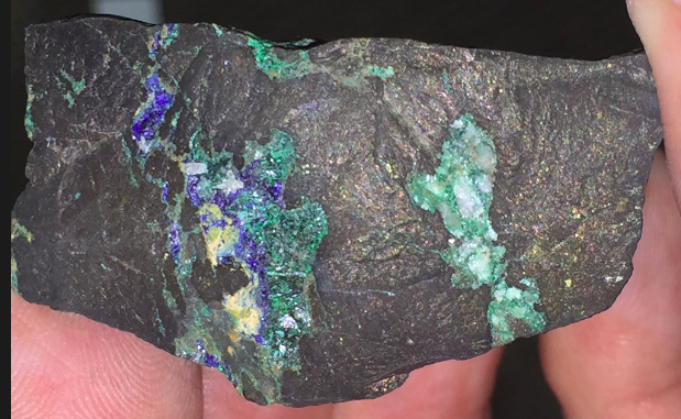 Vivianite dans une fissure d'une roche fondue, produit d'une houillère embrasée. (et donc pas une lave basaltique) [70mm]