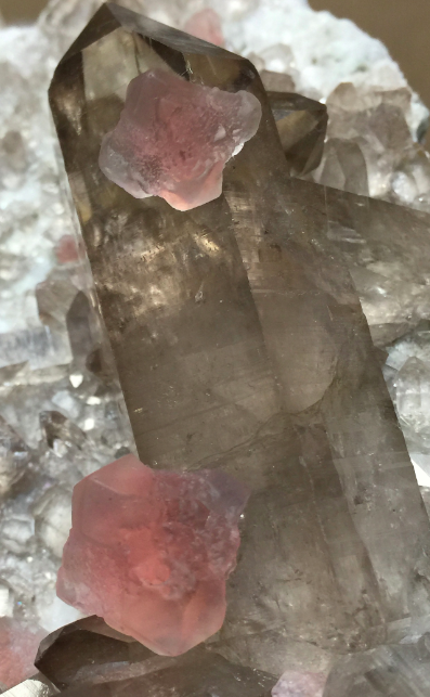Fluorine rose en octaèdres 'concaves', faciès peu commun dans la vallée, implantés sur quartz fumé presque citrin (foncé par la photo). [140mm]