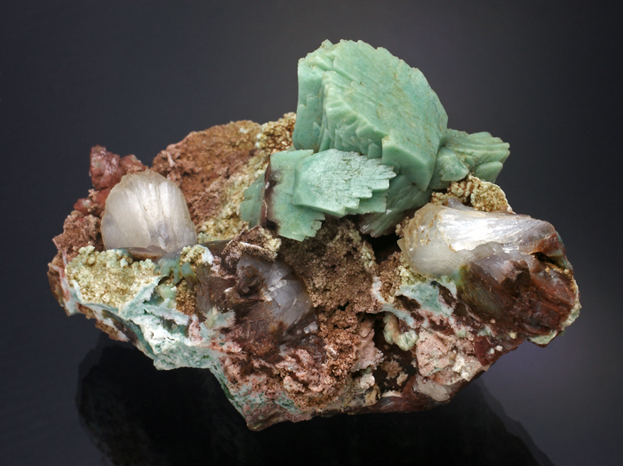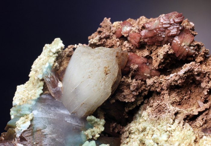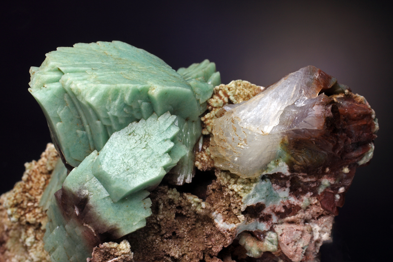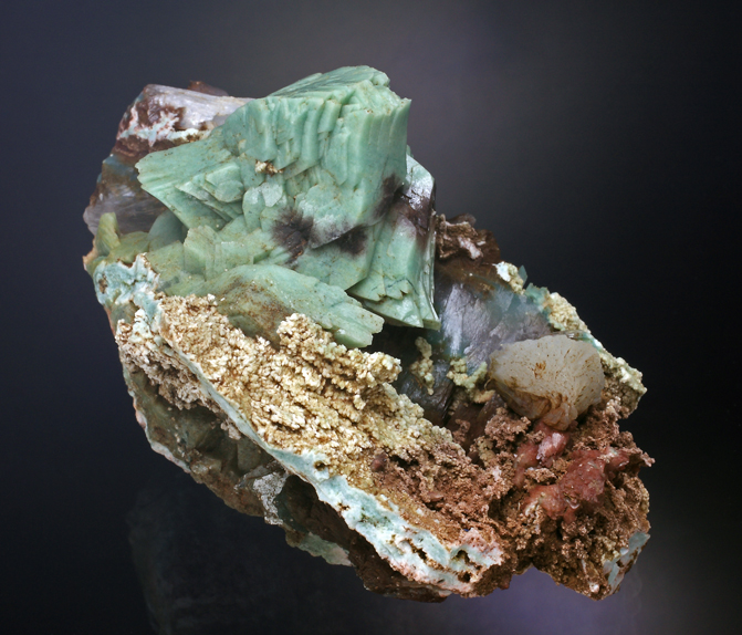 De nombreux spécimens d'HEULANDITE avec inclusions de CELADONITE sont proposés (provenance : Inde - Nashik district - Maharashtra). La pièce ci après m'a intéressée car elle présente sur le même spécimen 3 couleurs différentes d'Heulandite : verte (inclusion de Celadonite), blanche (commune) et rouge/brune ... voir photos