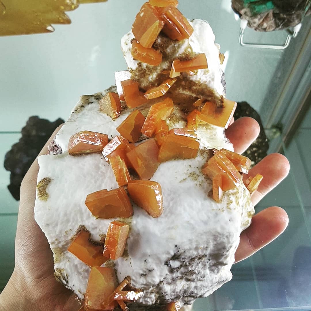 C'est assez classique ce genre de cristaux formant des tablettes légèrement translucides posées sur une gangue composée de Quartz pour celle-ci à première vue, qui à servi de support pour la formation des cristaux.
