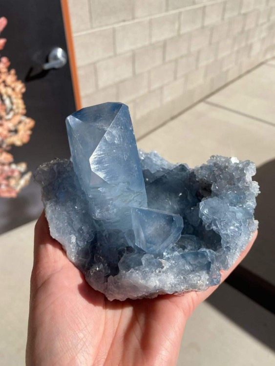Alala, fantastique celle-ci 🤩👍...ayant le nez dans les célestines (ariégeoises) ces jours-ci (groupe de la baryte, sulfate de strontium) je lisais justement que la couleur bleutée était la moins courante. Celles que j'ai sont d'un beau jaune/miel.