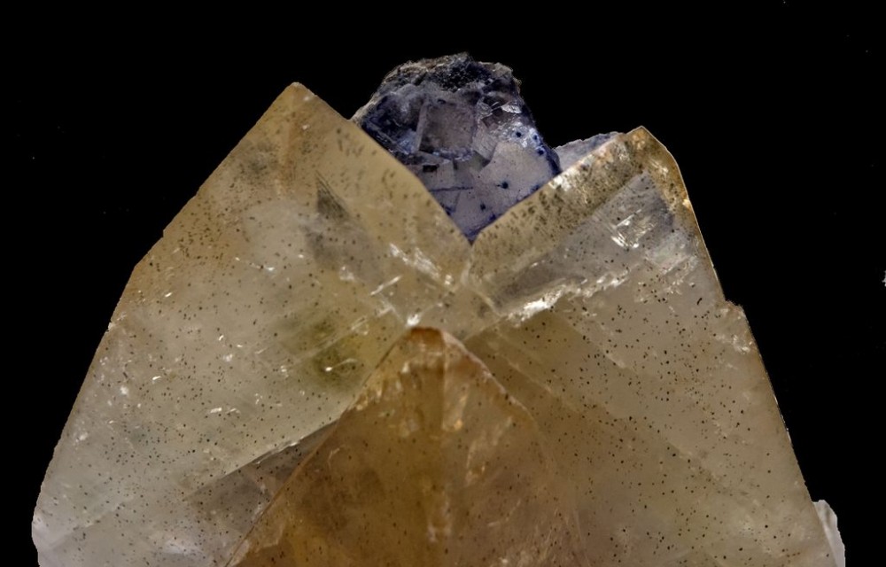 En revanche Franck 69, il n'y a pas de cubes de fluorine, c'est tout une histoire que je vous raconterai en photos, et qu'on pouvait deviner partiellment avec les photos disponibles : il reste quelques fluos partiellement dissoutes "dans les creux" et de nombreuses empreintes de fluos dans / sur les quartz et peut-être sur un béryl. Mais surtout, il reste 3 fluo incluses dans les quartz, a priori à la limite quartz fumé / quartz blanc. :grand sourire: