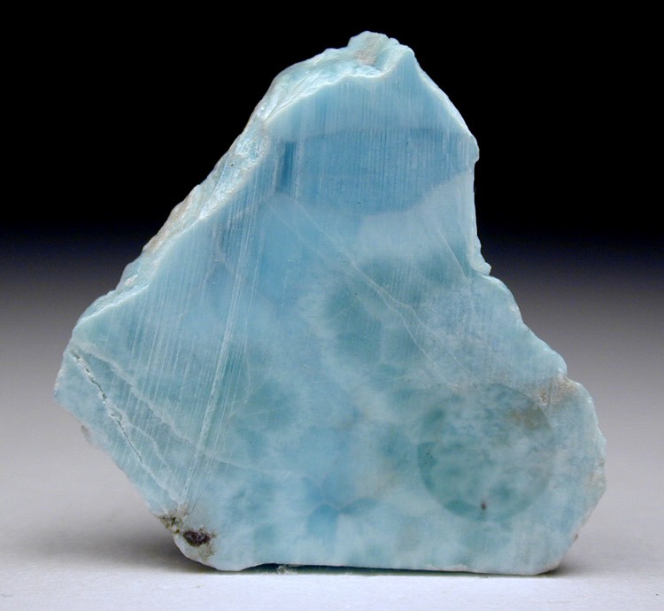 - Un morceau de larimar (une variété bleue de pectolite) en provenance de Los Chupaderos, Barahona, République Dominicaine. Dimensions 3,5 x 3,2 x 0,6 cm: