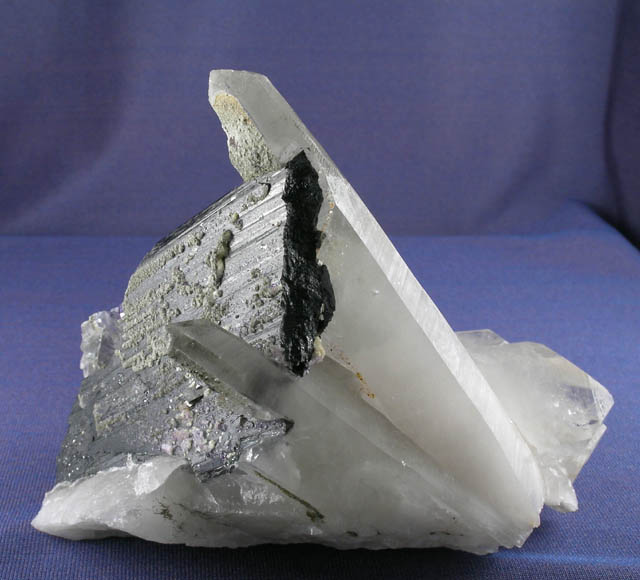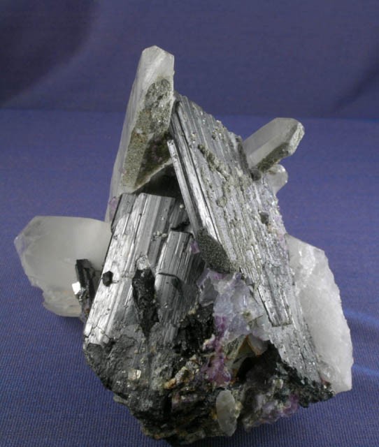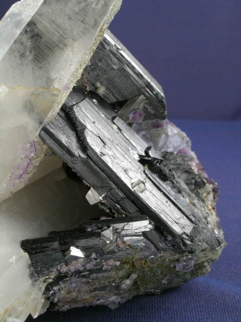 Le tout est agrémenté de nombreuses fluorites violettes gemmes de différentes tailles, ainsi que de noubraux cristaux d'arsénopyrite. Au chapitre micro, il y a aussi de la chamosite (une chlorite, je crois), de la muscovite, et de fines aiguilles de boulangérite dans certaines fluorites.