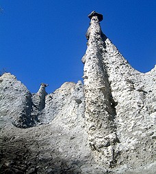 Pour répondre à ton interrogation Orléan, non les cheminées de fée ne subsistent pas à cause de la pression exercée par le bloc rocheux qui les surplombe, mais simplement parce que ce dernier forme un "chapeau" de roche dure qui protège les formations tendres sous-jacentes. C'est, si j'ose dire, un phénomène d'érosion différentielle, mais à petite échelle. Et quand je parle de formations tendres, il faut bien voir que ces formations tendres sont un minimum consolidées (un simple sable non consolidé s'écraserait sur lui-même, avec des pentes qui ne dépasseraient pas les 30-33°). J'espère que ça t'éclaire davantage ?