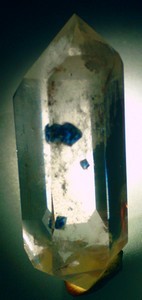 Un de mes plus étrange,ce quartz biterminé chinois(je pense).Présente une assez grosse cavité avec des inclusions liquide et solide(anthraxolite),mais également ,à l opposé un léger fantome de croissance fumé.