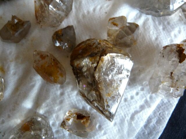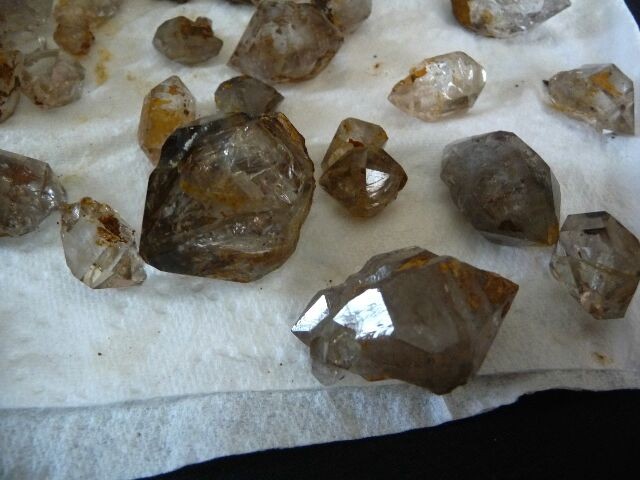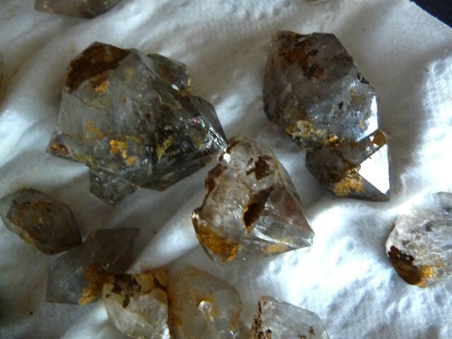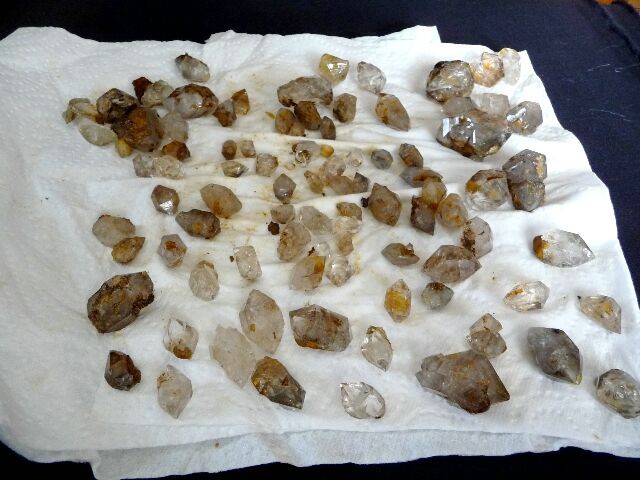 Une partie des quartz qui viennent de sortir du bain, le nettoyage n'est pas terminé, il faut que je les passe dans un chlorure stanneux pour enlever les traces d'oxydes.