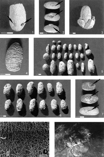 Figs. 1–9. 1, A fossil bee cell from the Quaternary of the Canary Islands showing a complete perforation and an incomplete one (arrows). 2, Possible wasp cocoons from the Paleocene-Eocene Claron Formation, USA (arrows show scars). 3, Internal ovoid cast of Rebuffoichnus casamiquelai from the Late Cretaceous Laguna Palacios Formation of Argentina (note the wall remains in the lower end). 4, Mud cocoon of a Noctuidae. 5, Armored clay balls showing a wide spectrum of shapes. 6, Selected armored clay balls from 5 resembling ovoid cocoons. 7, Mammal droppings showing ovoid shape and ecuatorial scars (arrows). 8, Silk net of a sphecoid cocoon (350×). 9, Pore of a sphecoid cocoon (75×). Scale bars: 1 cm