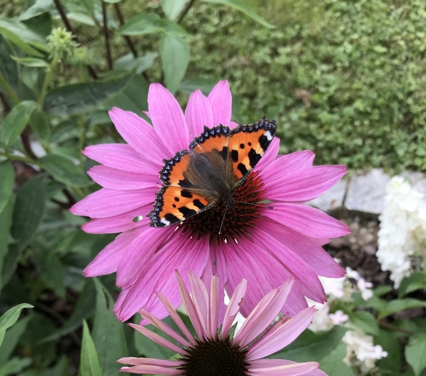 Petite tortue / Vanesse de l'ortie (Aglais urticae), posée sur une fleur d'echinacée (Echinacea purpurea 'Magnus'') - un cultivar de rudbeckia que j'adore, de grande taille, très florifère, particulièrement résistant à l'humidité et à la sécheresse et qui pousse même en sol maigre!-.