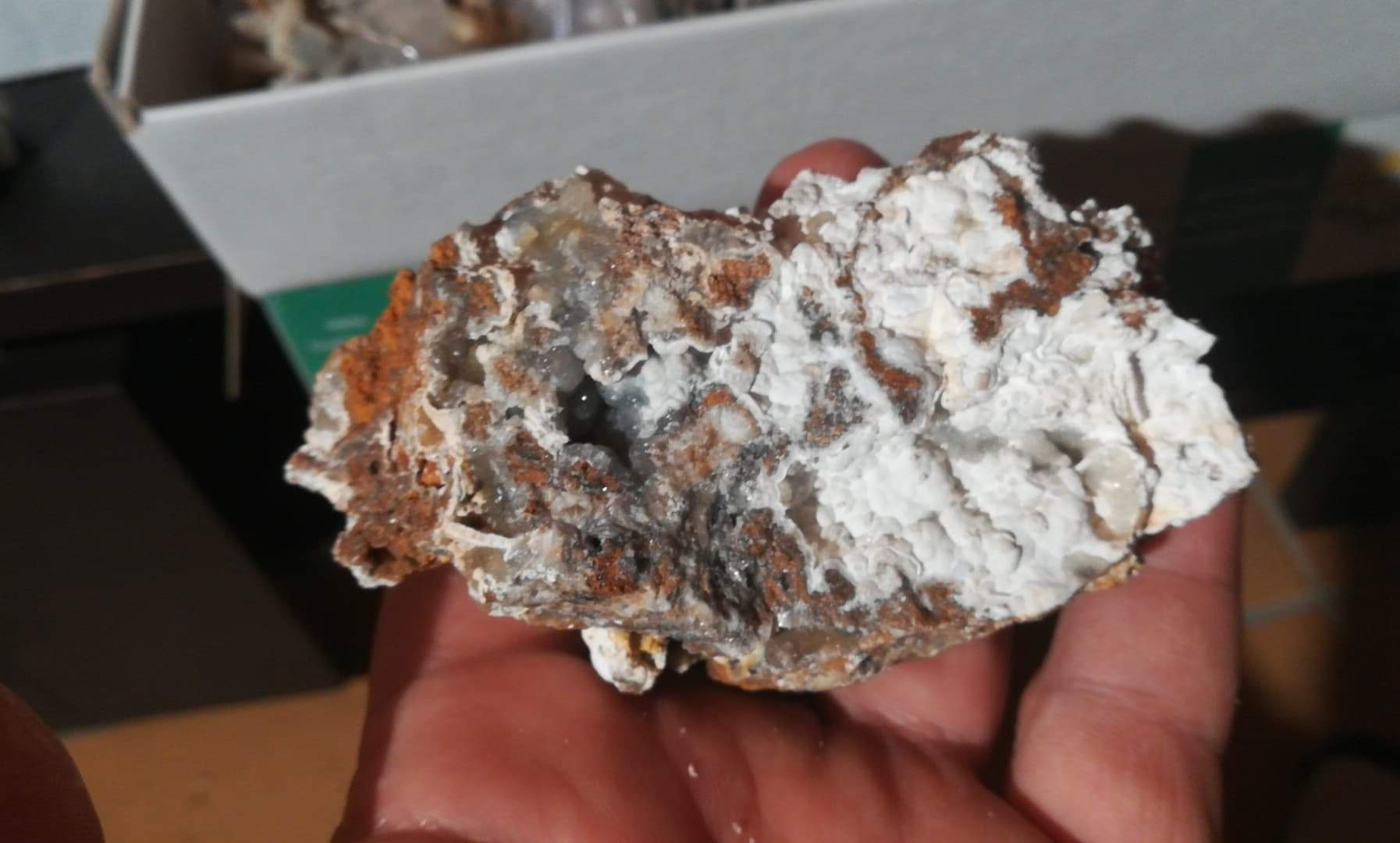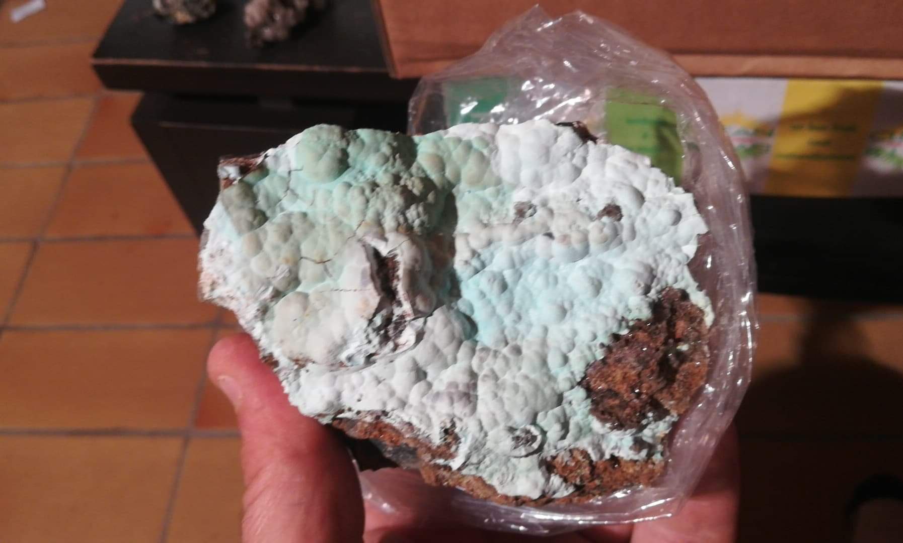 ah mince !! j'ai baryte associé a smithsonite du coup que a l'eau , encore ça vas celle que j'ai extraite est belle comme elle est mais j'ai trouve une geode dans de la roche très dure les parois intérieur de la géode sont tapissé de smithsonite et au fond il y as 3 ou 4 pompons de baryte....du coup si je l'extrais je pourrais pas la nettoyer ...Grrrrrr.....Je vais quand meme l'extraire 15 jours quelle m'attend mais il me faut un perfo percuteur ...j’économise .....