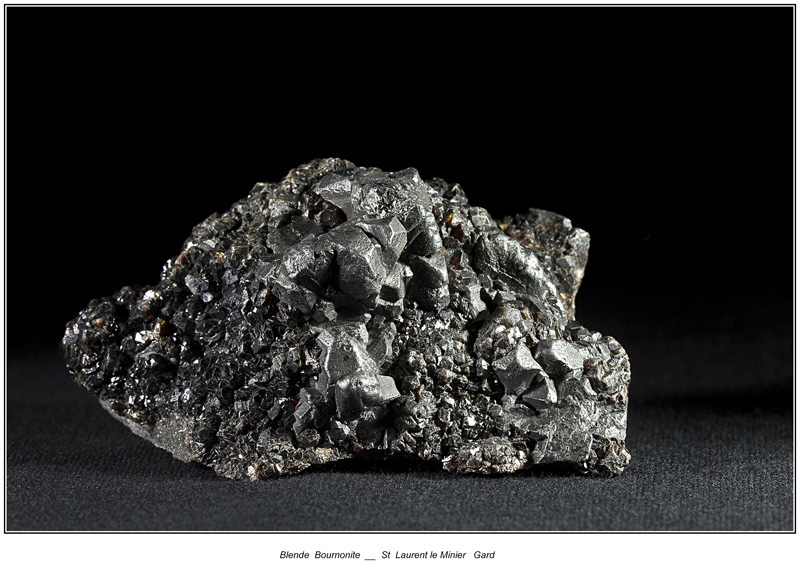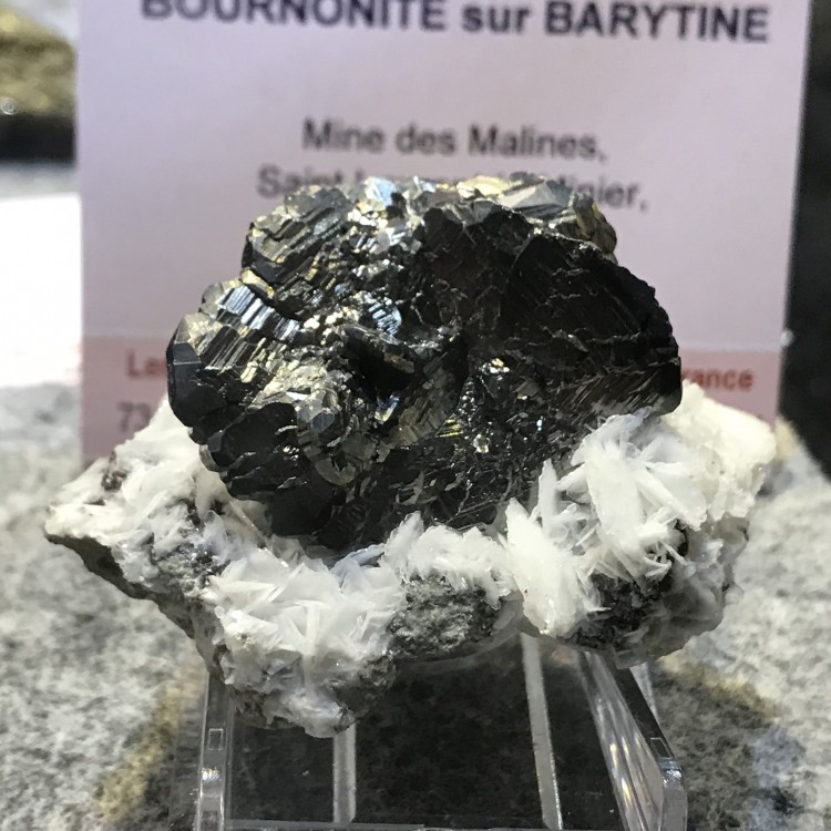 Ces Bourno brillantes accompagnées de fines lamelles de Barytine, furent extraites d'une poche exceptionnelle en 1990 à La Sanguinède au Panneau 21, il y a eu très peu de pièces en circulation (une vingtaine de pièces trouvées).