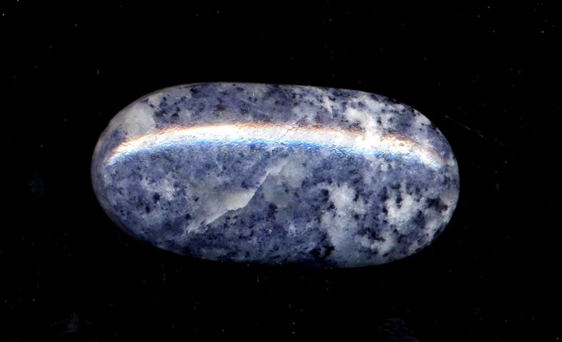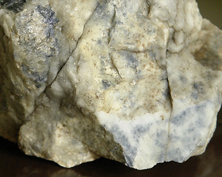 la roche bleue forme des zones plus ou moins concentrées en minéraux collorés. Roche difficile à polir, surtout les parties les plus sombres.