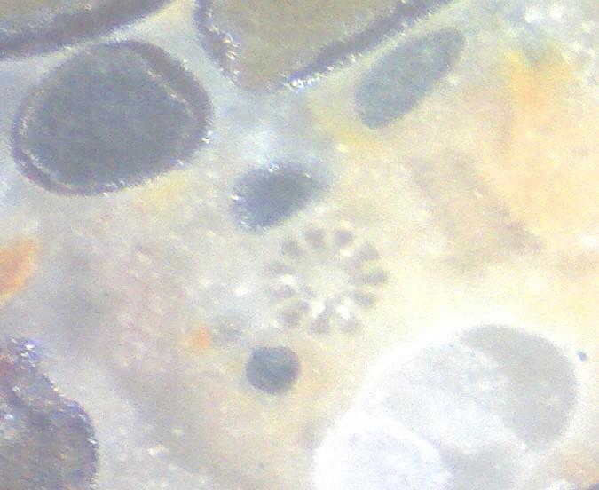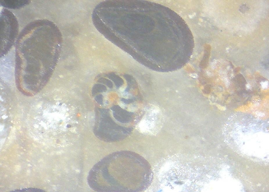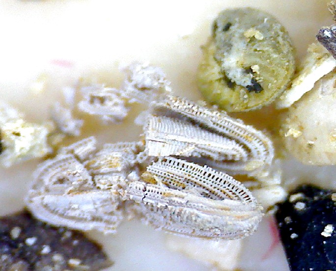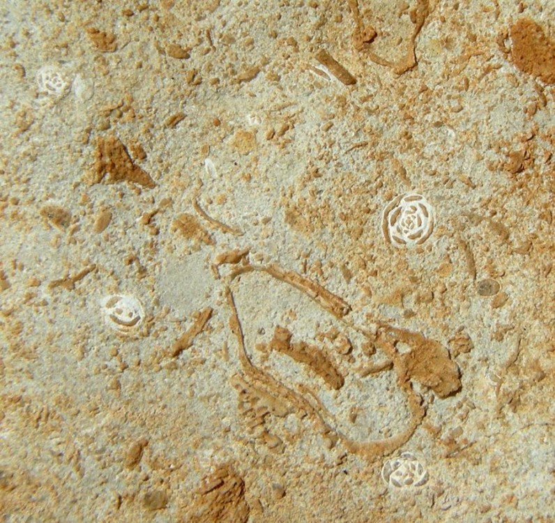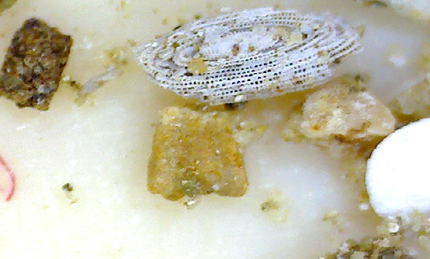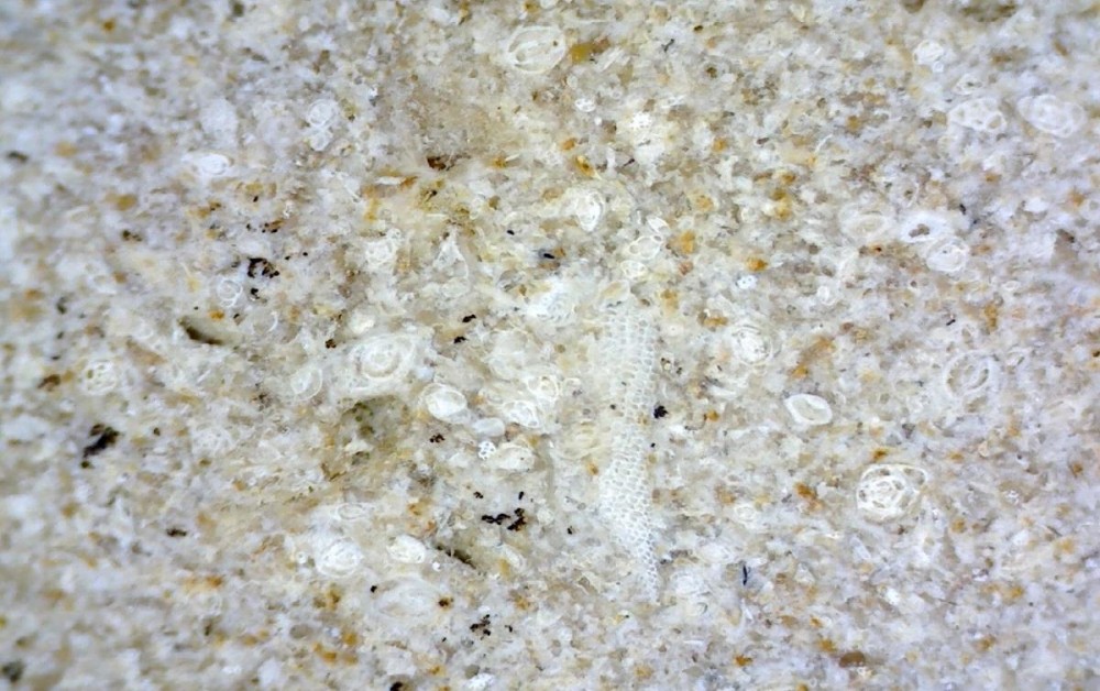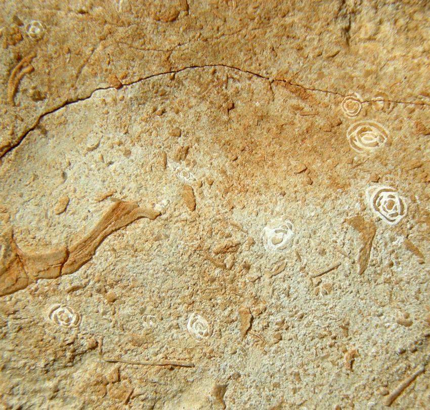 Des foraminifères du groupe des milioles sont visibles sous le forme de points blancs sur les morceaux de calcaire, ici à la face inférieure d'un échantillon d'environ 30 centimètres de large.