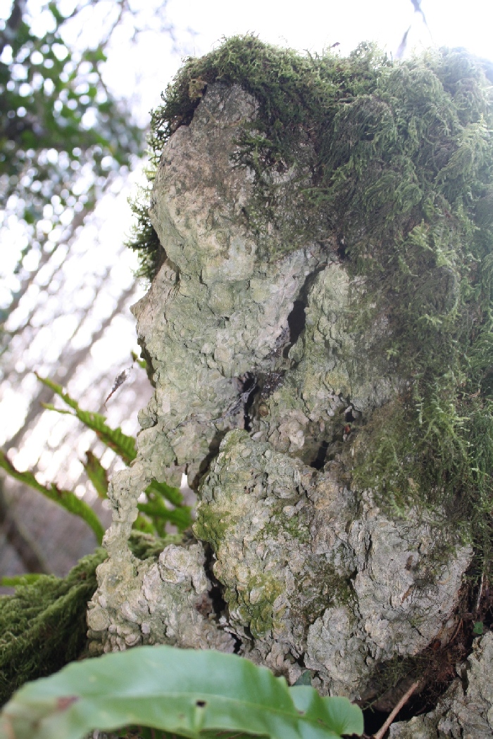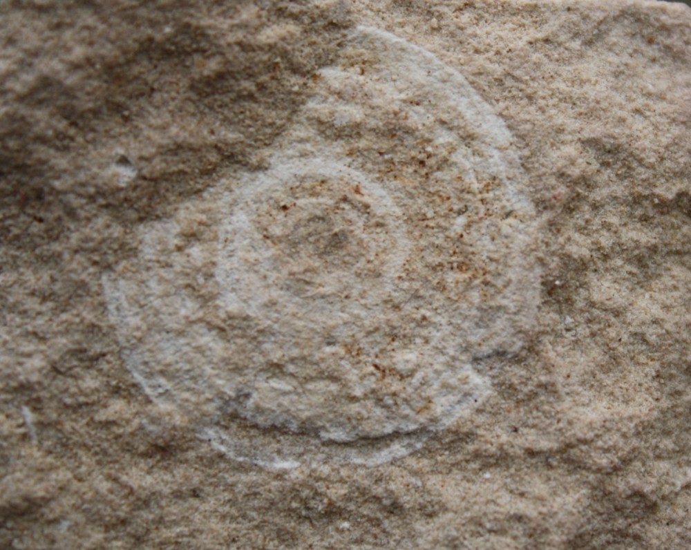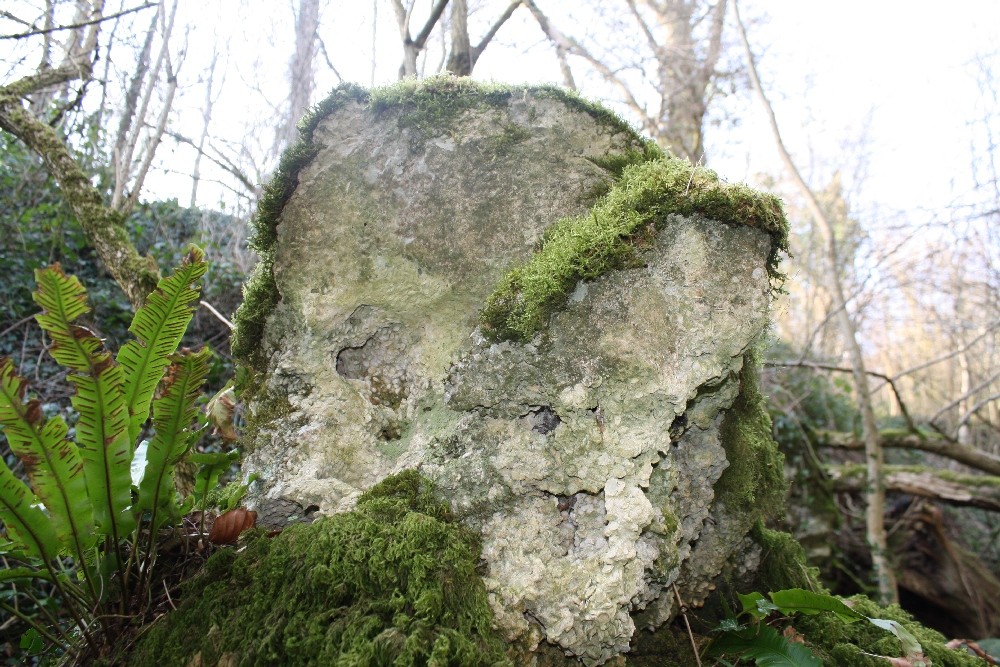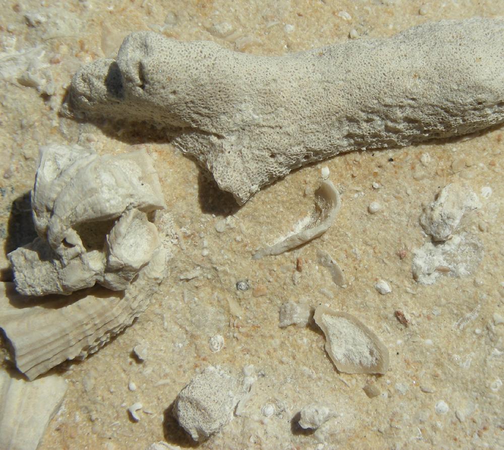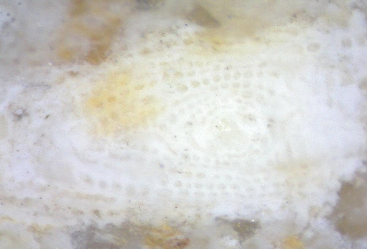 Des foraminifères du groupe des milioles sont visibles sous le forme de points blancs sur les morceaux de calcaire, ici à la face inférieure d'un échantillon d'environ 30 centimètres de large.
