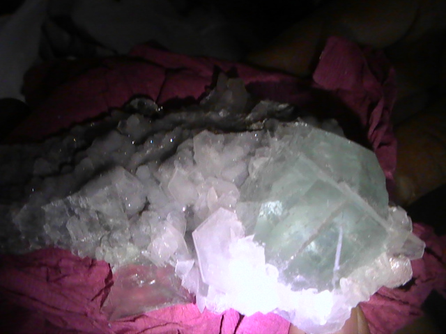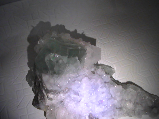 Je n'ai pas mais j'ai vu de belles fluos associées à de la calcite et pyrite ou chalcopyrite de couleur bleu électrique ! (bleu gris foncé !), minimum 400 euros !