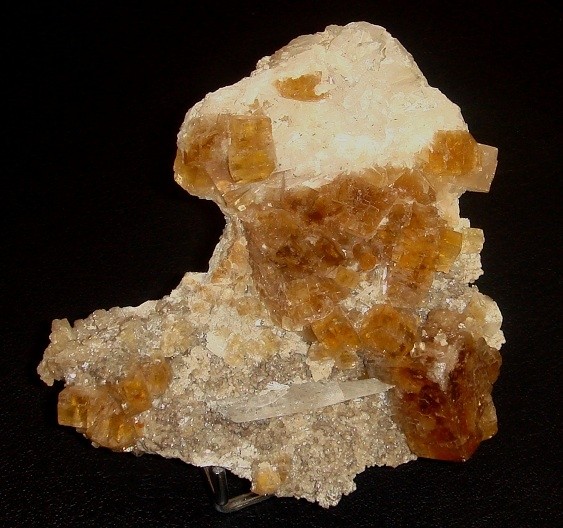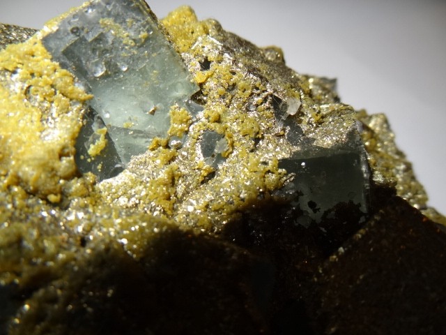 Ensuite une rare l'avellan avec cube seul de 4 cm et, encore plus rare une extraordinaire blende de la mine du beix sur fluo verte avec pyrite. Vous noterez les fluos en couloir en seconde génération qui sont typiques des niveaux supérieurs au Beix ( les boules de blende font 4 cm).