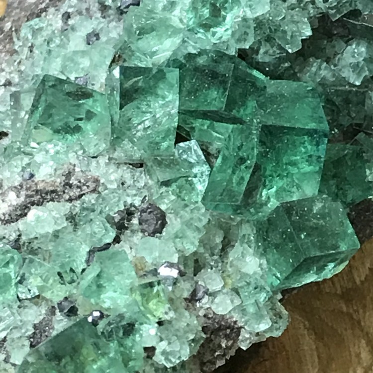 J'ai exactement le même type de pièces (plus petites) fluo verte maclée associée à des octaèdre de galène corrodés