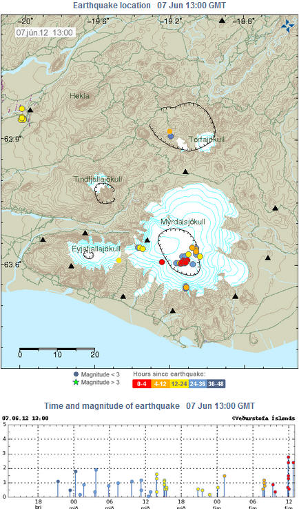 Un contact à l'institut de géophy de Reykjavik m'a fait part hier qu'une petite coulée c'était mise en place il y a une dizaine de jours sur la partie sommitale de l'Eyjafjall.