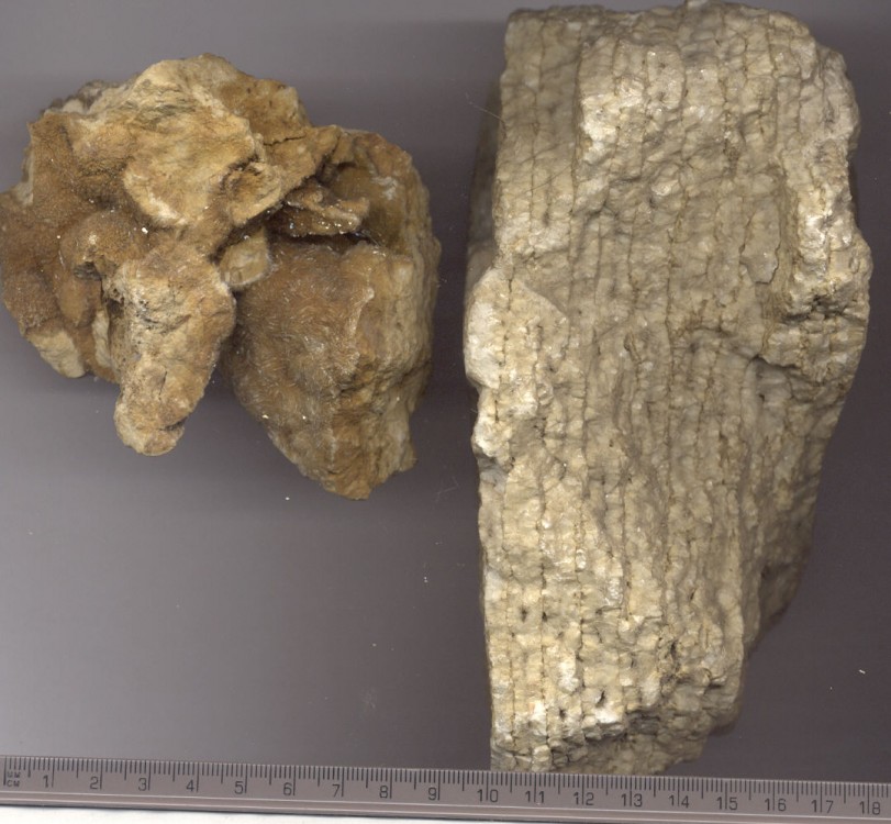 celle-ci n'est pas belle, même plutôt moche, mais elle est de chez nous, les chtis: nodule de Baryte sédimentaire avec morceau montrant la structure interne, trouvée dans les argiles du Gault au Cap Blanc Nez à l'heureuse époque où le sable n'avait pas envahi l'estran argileux (actuellement introuvable) Intérêt: elle fluoresce dans l'UVL.