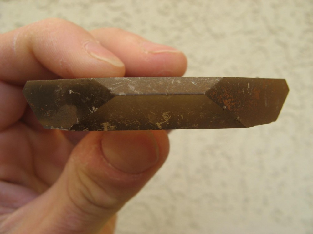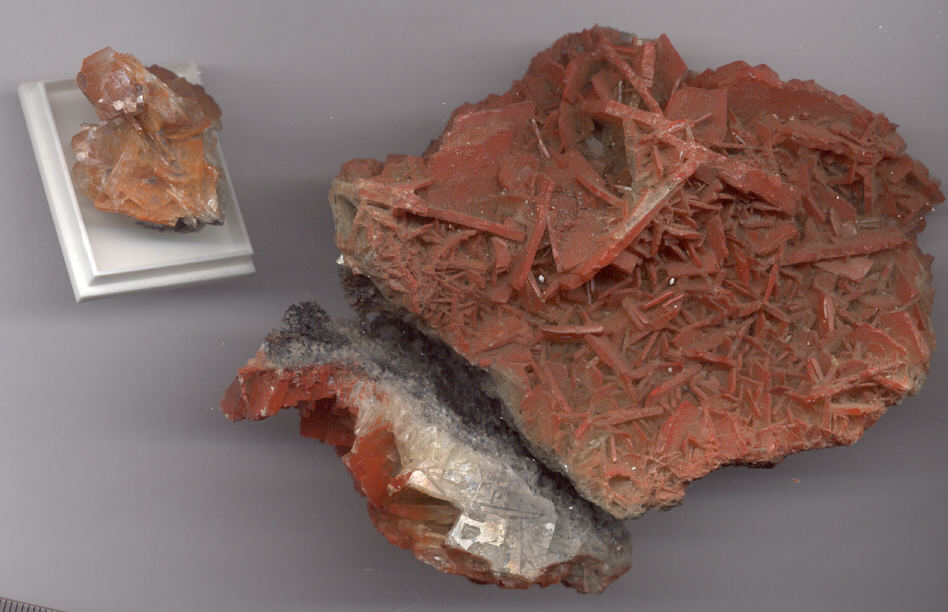 dans le registre faux et usage de faux voici deux barytes peintes à la mode tzigane, et une vraie roumaine rouge (inclusions de réalgar) les deux peintes à droite sont rouges en surface et uniformément, tandis que la vraie rouge est colorée partout mais pas uniformément.