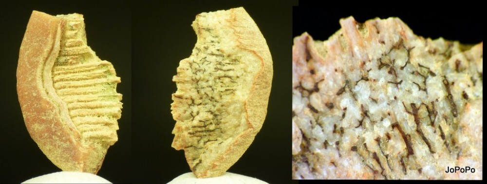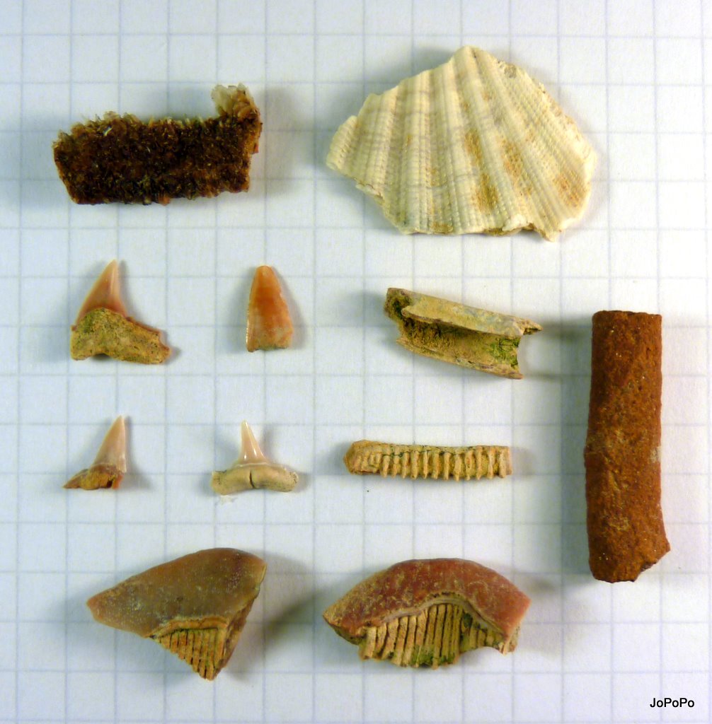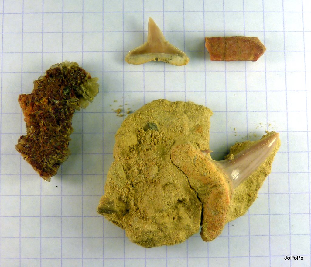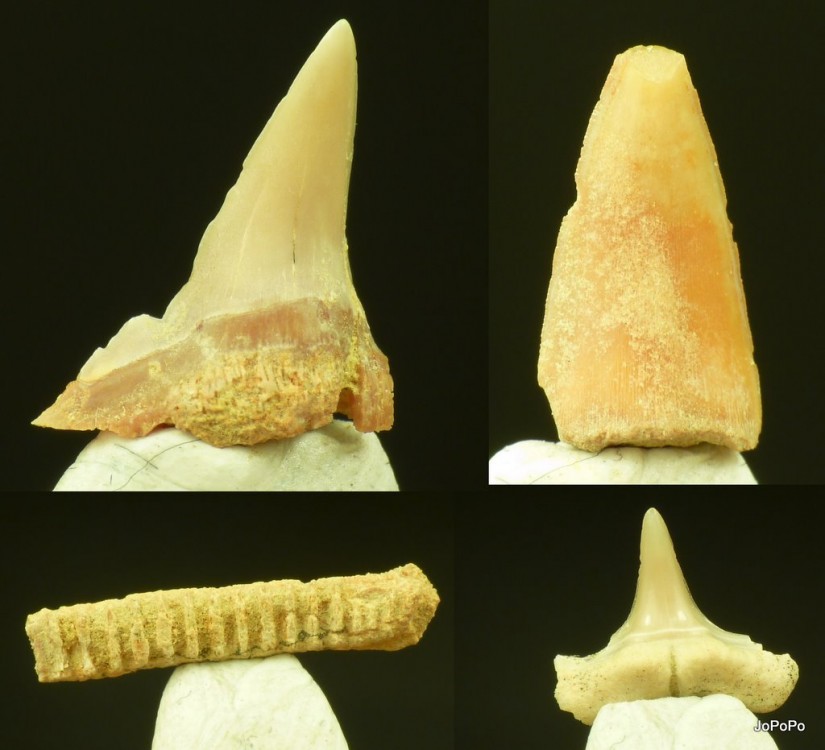 - 2 dents de Raie, avec une qui présente une assez surprenante conservation des canaux sanguins/nerveux (?) fossilisés