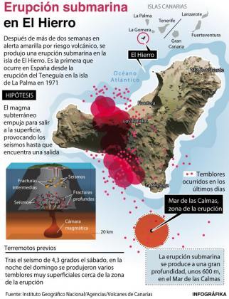 pour la création d'une ile sur le long terme ce n'est pas encore gagné puisque le modèle théorique del Hierro est une zone de rifting à trois branches orientées à 120° (en Y), et cette éruption offshore l'illustre parfaitement au Sud du Y del Hierro :