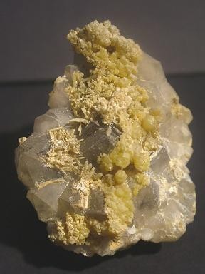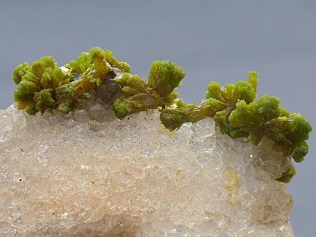 Pyromorphite sur cristaux de quartz, Urbeis, Bas-Rhin, France.