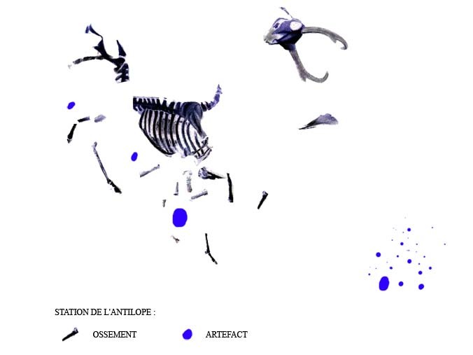 une aire de dépeçage avec présence de 3 outils, trace de ces outils sur les os. Les os longs ont été brisés volontairement.