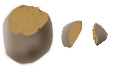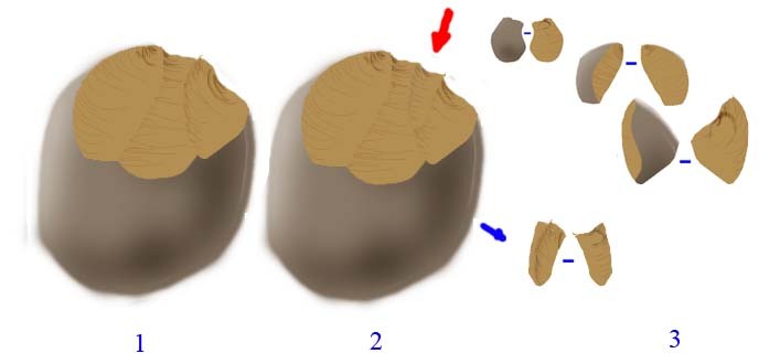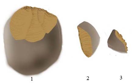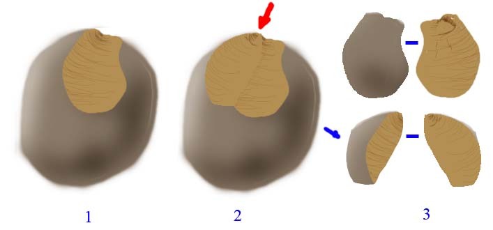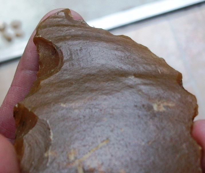 Aussi qu'on on utilise un percuteur et qu'un eclat est détaché: on observe systematiquement sur la face d'eclatement de l'eclat un renflement nommé bulbe ou cone de percussion dont la base prend naissance à l'endroit ou le coup a été porté. Ce cone qui ressort en positif est plus ou moins marqué suivant la nature du percuteur utilisé (roche,bois...), il est généralement suivi d'ondulations caracteristiques de la propagation de l'onde de choc au sein de la matière. On retrouvera donc en négatif ces éléments sur le bloc duquel a été détaché l'eclat